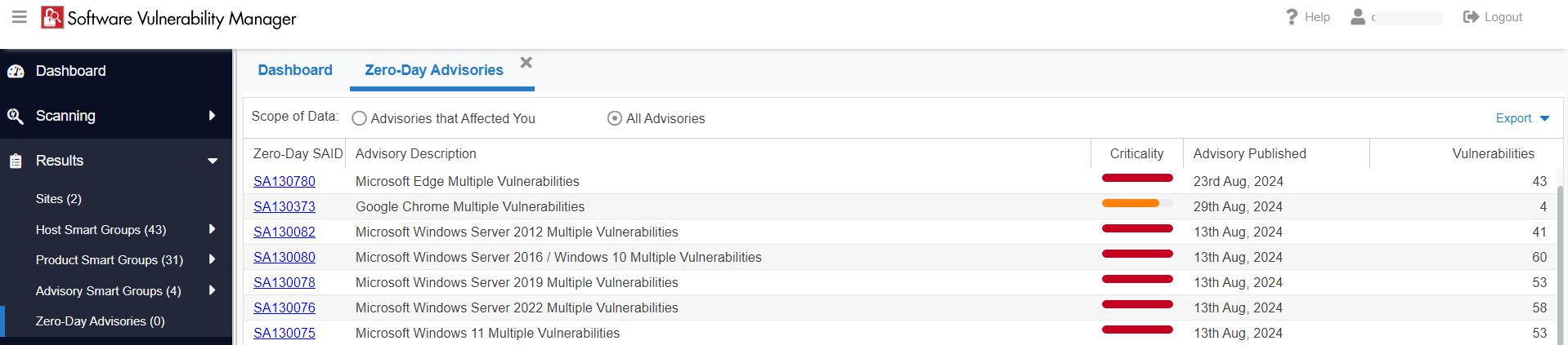 Shows a filtered list of zero-day advisories that have specifically impacted your environment.