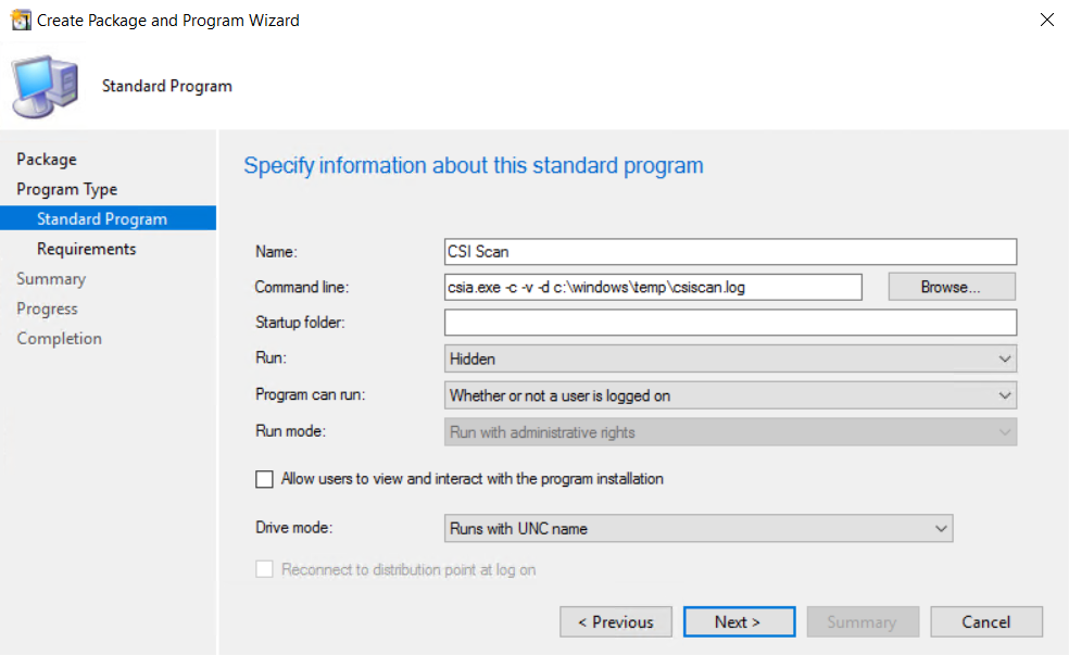 csia.exe -c -si 120 -v -d c:\windows\temp\csiscan.log(creates a scan log file up to 16 MB in size) -